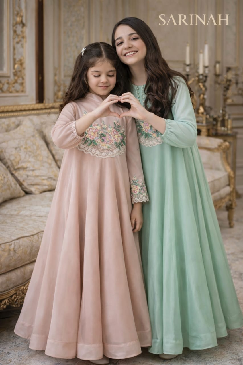 Dress your little ones in ethereal charm with these flowing organza gowns. Available in soft peach and mint green, these ready-to-wear dresses feature delicate floral embroidery and a wide-flare silhouette, ensuring a perfect fit for weddings, parties, and formal celebrations.