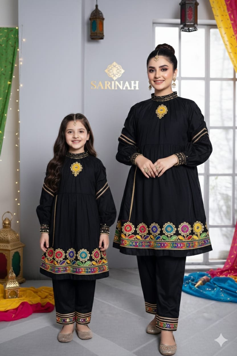 Celebrate the bond of “twinning” with this premium black cotton-lawn ensemble. Featuring vibrant floral embroidery and a high-neck tailored silhouette, this ready-to-wear set offers a perfect fit for both mother and daughter, making it the ideal choice for festive family gatherings and Eid celebrations.