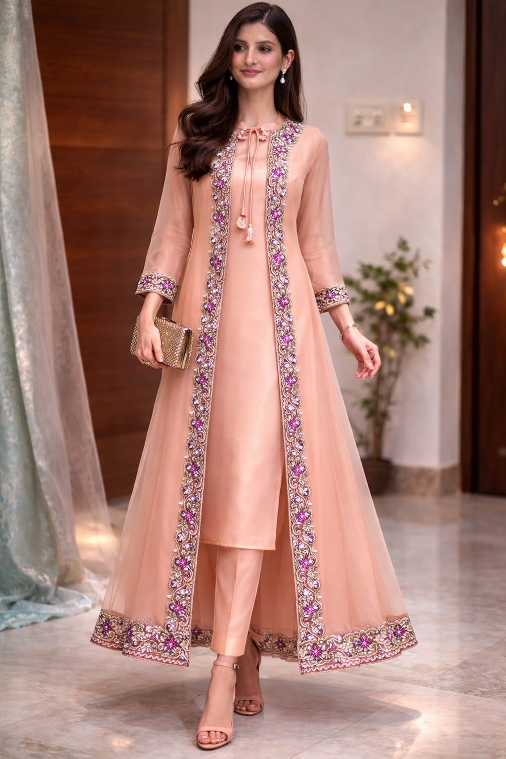Experience ethereal elegance with this soft icy mint ensemble, delicately detailed with shimmering silver tilla and light-catching sequins. This ready-to-wear set is precision-tailored for a perfect fit, offering a graceful and coordinated “twinning” look for mothers and daughters at daytime weddings and festive summer celebrations.